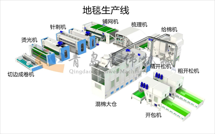 開包機(jī)-開松機(jī)-振動給棉機(jī)-梳理機(jī)-鋪網(wǎng)機(jī)-針刺機(jī)-切邊成卷機(jī)