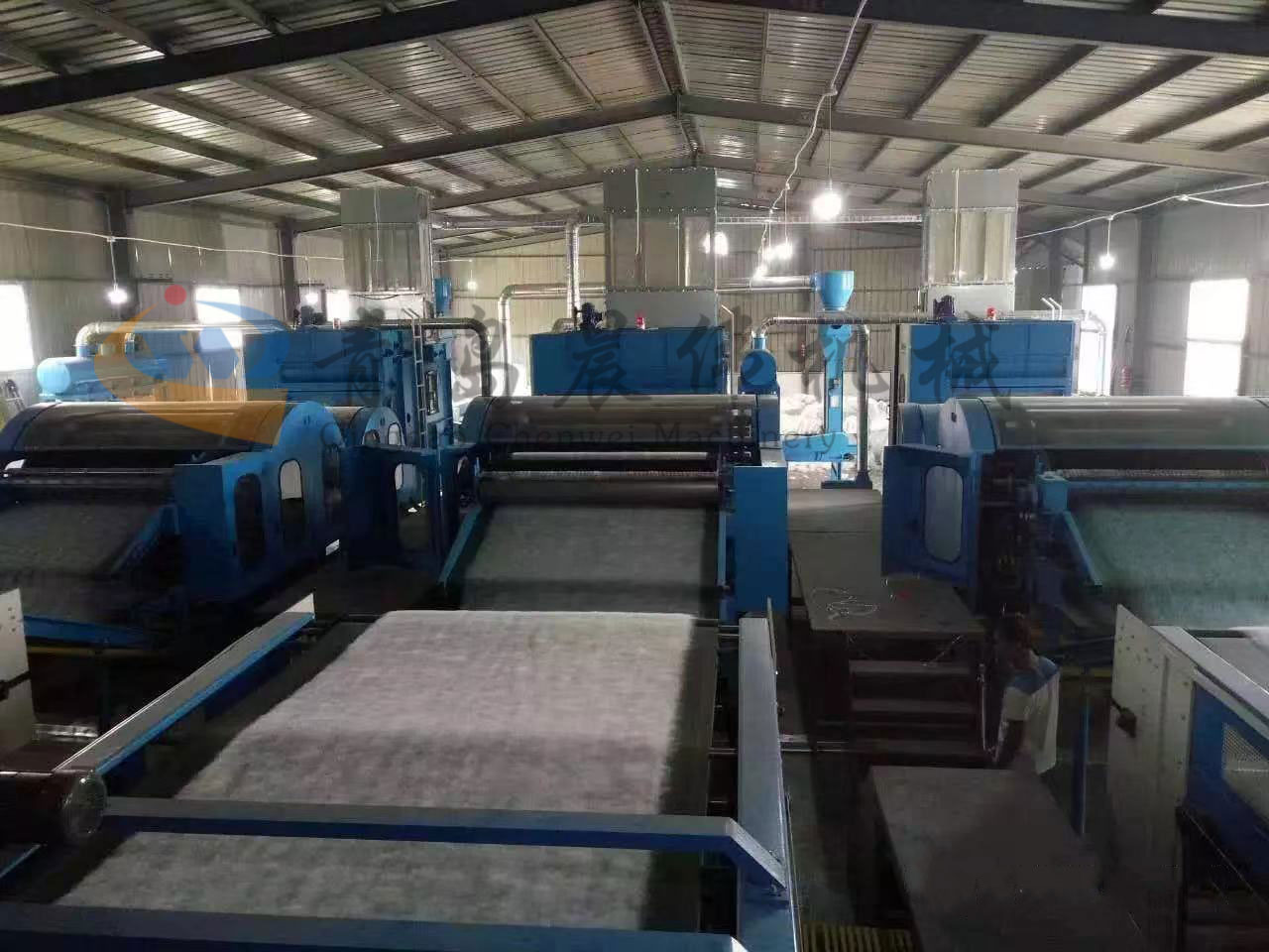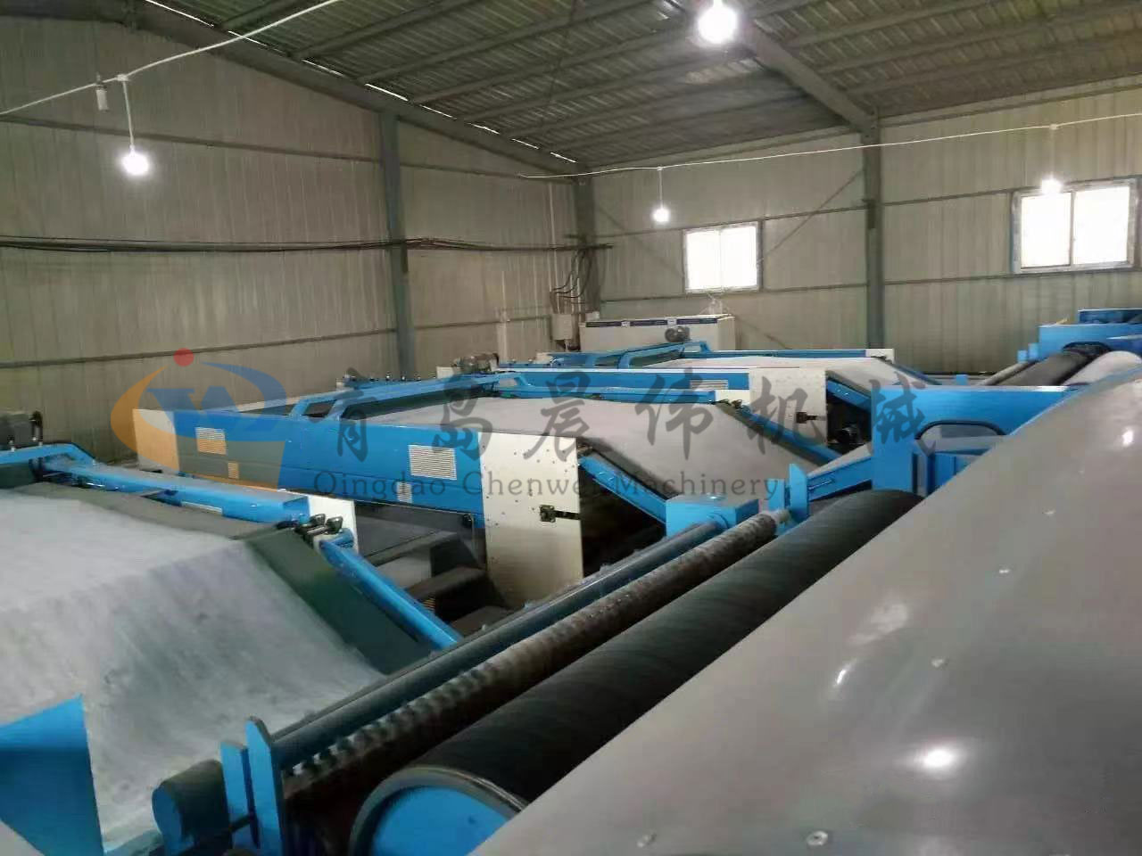 開包機(jī)-開松機(jī)-振動給棉機(jī)-梳理機(jī)-鋪網(wǎng)機(jī)-烘房-燙光機(jī)-成卷切片機(jī)